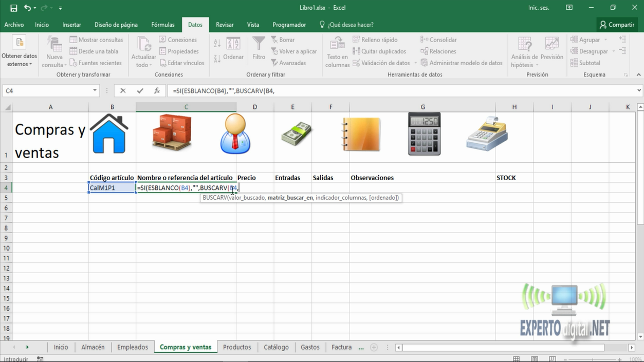 Para resolver ese argumento nos valdremos de la función BUSCARV ¿Qué hace la función BUSCARV? Busca un valor en la primera columna izquierda de una tabla y luego devuelve un valor en la misma fila que proviene de una columna especificada. En otras palabras, dependiendo del código que seleccionemos en la celda B4 completará la celda C4 con los valores de la columna correspondiente de la hoja PRODUCTOS.