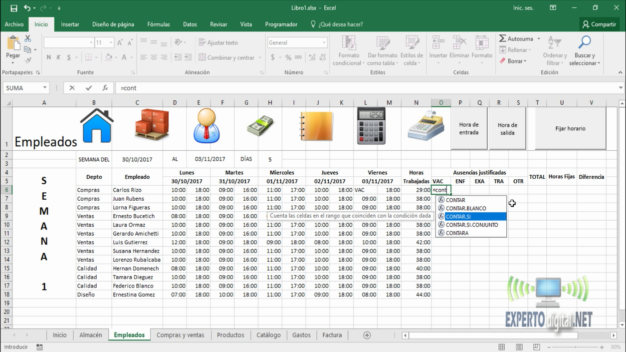 La función CONTAR.SI cuenta las celdas de un rango que coinciden con una condición especificada. Valiéndonos de esta carácterística de la función CONTAR.SI lograremos que los empleados puedan tener ausencias justificadas en caso de que lo necesiten