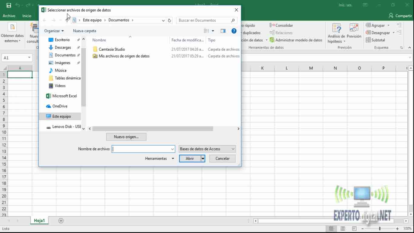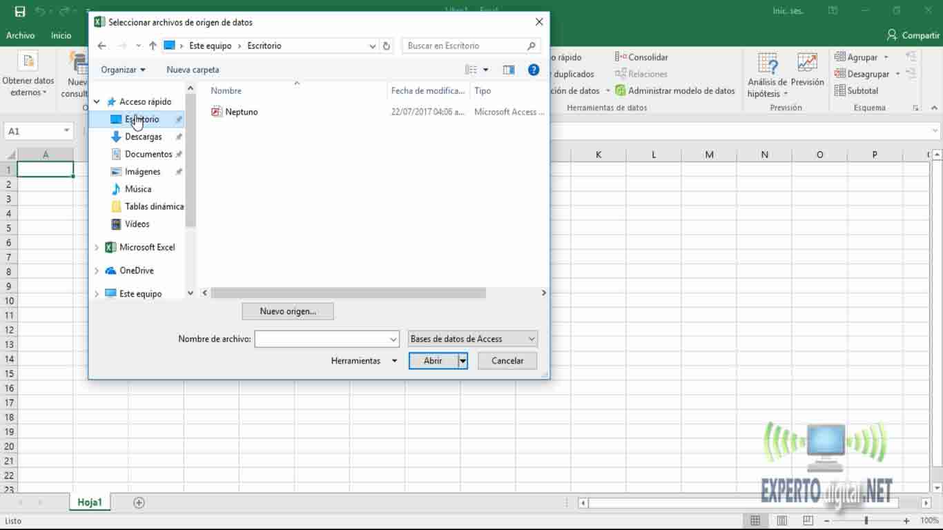 Al hacer clic en el botón, se abrirá un cuadro de diálogo llamado «Seleccionar archivos de origen de datos» desde el cual buscaremos el origen o la ubicación del archivo de Access. Para este ejemplo lo tengo en la carpeta «Escritorio».