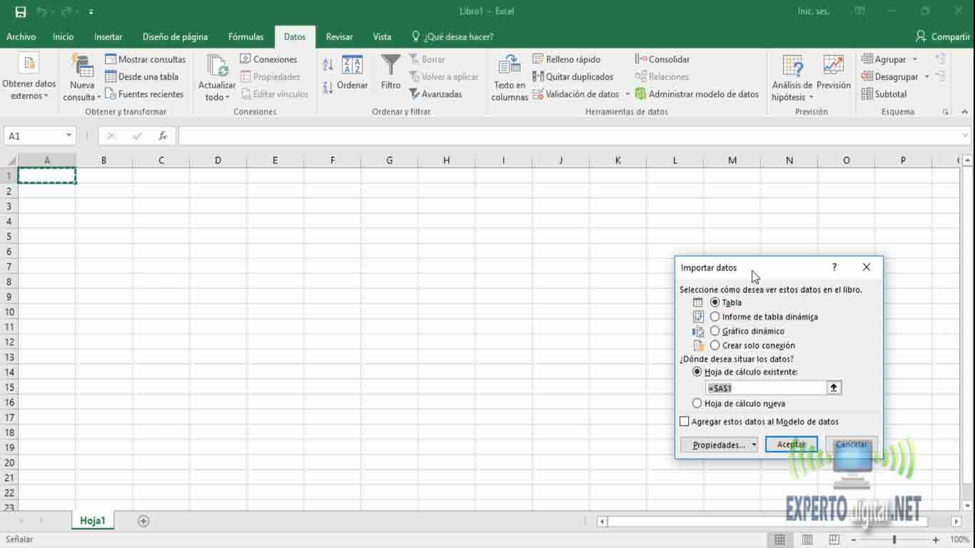 Una vez que quedó seleccionada esa consulta, hacemos clic en el botón «Aceptar» y vemos que se muestra un nuevo cuadro de diálogo, más pequeño que los anteriores, llamado «Importar datos». Para entender lo que está ocurriendo, si este cuadro de diálogo pudiera hablar, nos estaría preguntando «¿Cómo quieres ver los datos qué estás por importar?» «¿Cómo una tabla?», «¿Cómo un informe de tabla dinámica?», «¿Cómo un gráfico dinámico?», «¿Cómo una conexión de datos?».