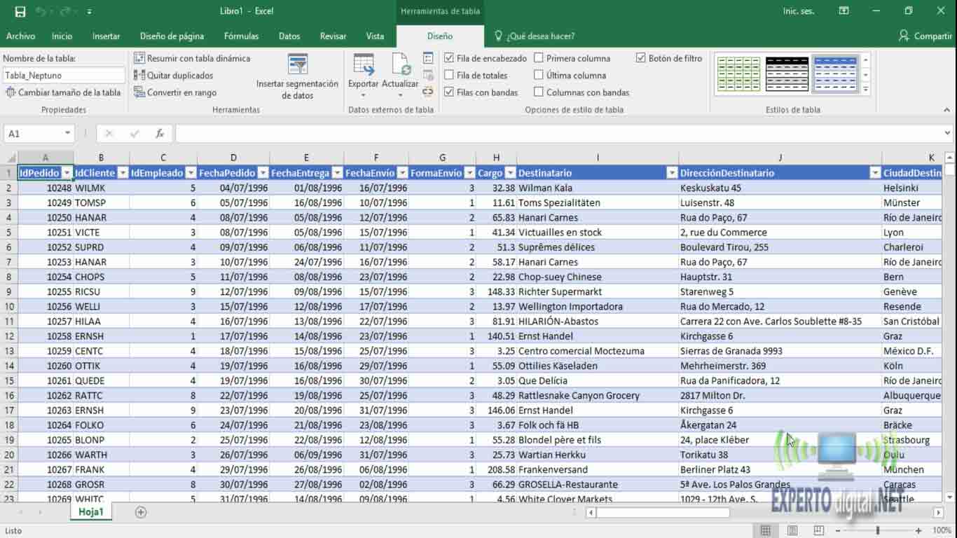 Al hacer clic en el botón «Aceptar» y los datos de la consulta de pedido de Access se acaban de importar a Excel en formato de tabla.