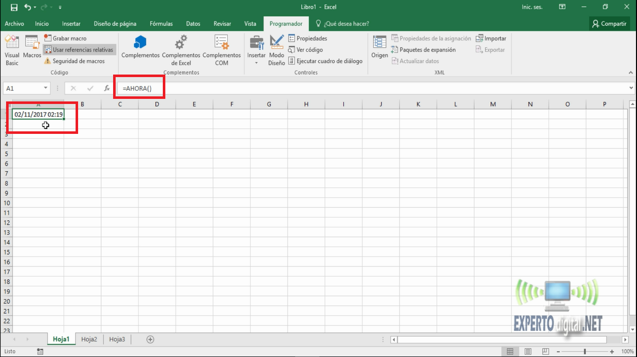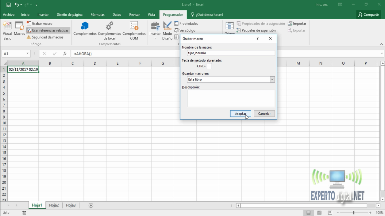 Esta macro lo que hará es crear la función AHORA en la celda sobre la que hagamos clic. Esa es la razón de porqué activamos primero el botón “Usar referencias relativas”.