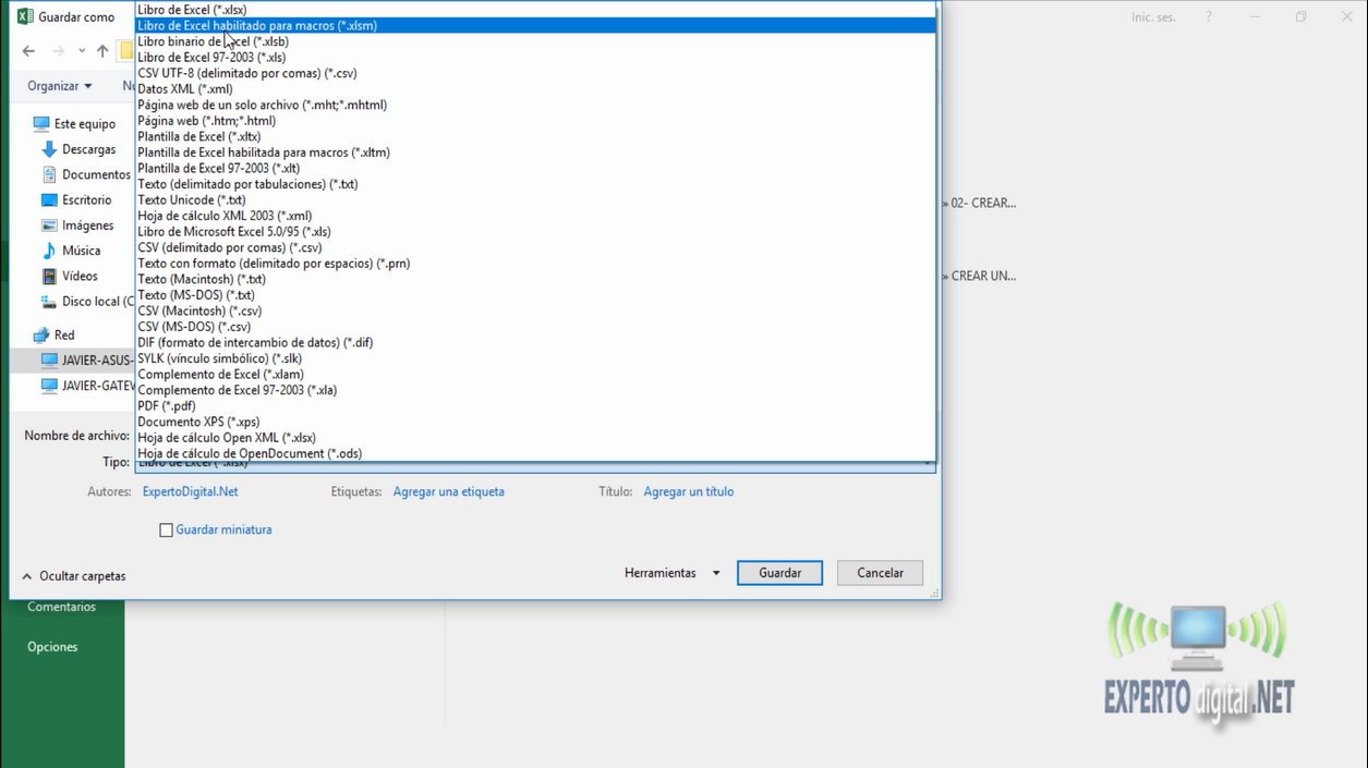 Hacemos clic en la ficha “Archivo” y en la opción “Guardar cómo”. Esto nos mostrará una serie de ubicaciones recomendadas a donde podemos guardar nuestro archivo. Pero lo más importante no es donde lo guardemos, sino el formato en el que lo guardemos. Para cambiar ese formato, vamos a hacer clic en donde ahora dice “Libro de Excel” y de la lista desplegable que nos aparece, seleccionamos la opción “Libro de Excel habilitado para macros”