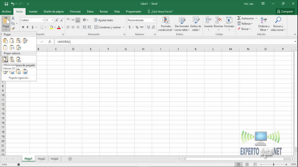 Lo primero es que, gracias a haber dejado la celda activa en donde está la función, ahora presionamos la combinación de teclas CTRL + C ¿Para qué? Para que la macro grabe la acción de copiar esa celda. Luego, y mientras la marquesina indica que la celda fue copiada, la macro debe registrar nuestra acción de hacer clic en la ficha “Inicio”, y posteriormente en la pequeña flecha negra que está debajo del ícono del botón llamado “Pegar”. ¿Y qué otra acción deseo que grabe esta macro? La acción de hacer clic sobre el botón llamado “Pegar valores”. Con este paso, conseguimos hacer que la función AHORA desaparezca y solo queden los valores dentro de la celda.