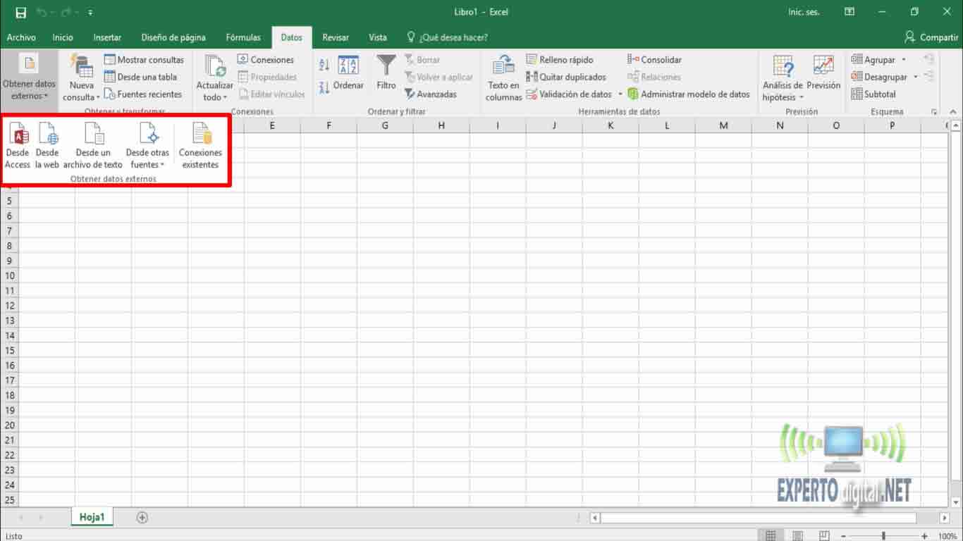 Una vez que hayamos respondido a la pregunta de cuál va a ser el origen de nuestros datos, estamos en condiciones de abril nuestro archivo de Excel, ir a la pestaña datos, y veremos que en el primer grupo llamado “obtener datos externos”, tendremos disponibles todas las opciones desde las cuales podemos comenzará a trabajar con la importación.