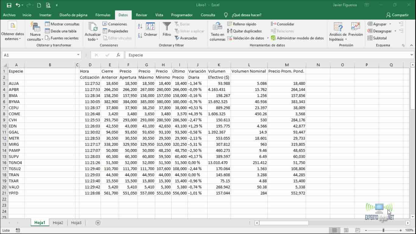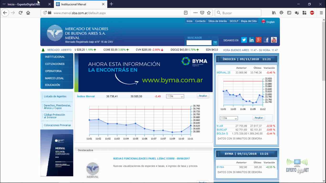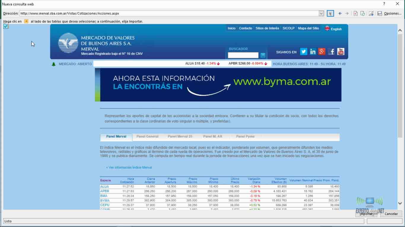 Para poder extraer información desde páginas web en Excel, lo primero que se necesita, obviamente es tener un sitio web que contenga información que se pueda extraer. En esta página web que es de la Bolsa de valores de Buenos Aires.