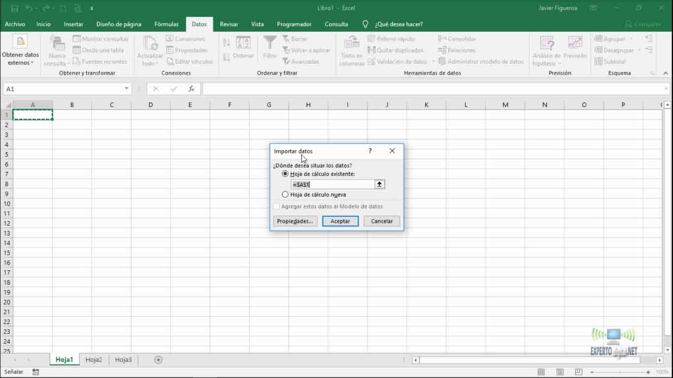 Una vez que los datos quedaron seleccionados, se hace clic en el botón «Importar» y veremos que en primer lugar, el navegador se cierra. Pero además, inmediatamente después, se muestra el cuadro de diálogo «Importar datos» que nos invita a que los datos se importen a partir de la celda A1. Hacemos clic en el botón «Aceptar» y en la barra de estado verás información en tiempo real de la importación.